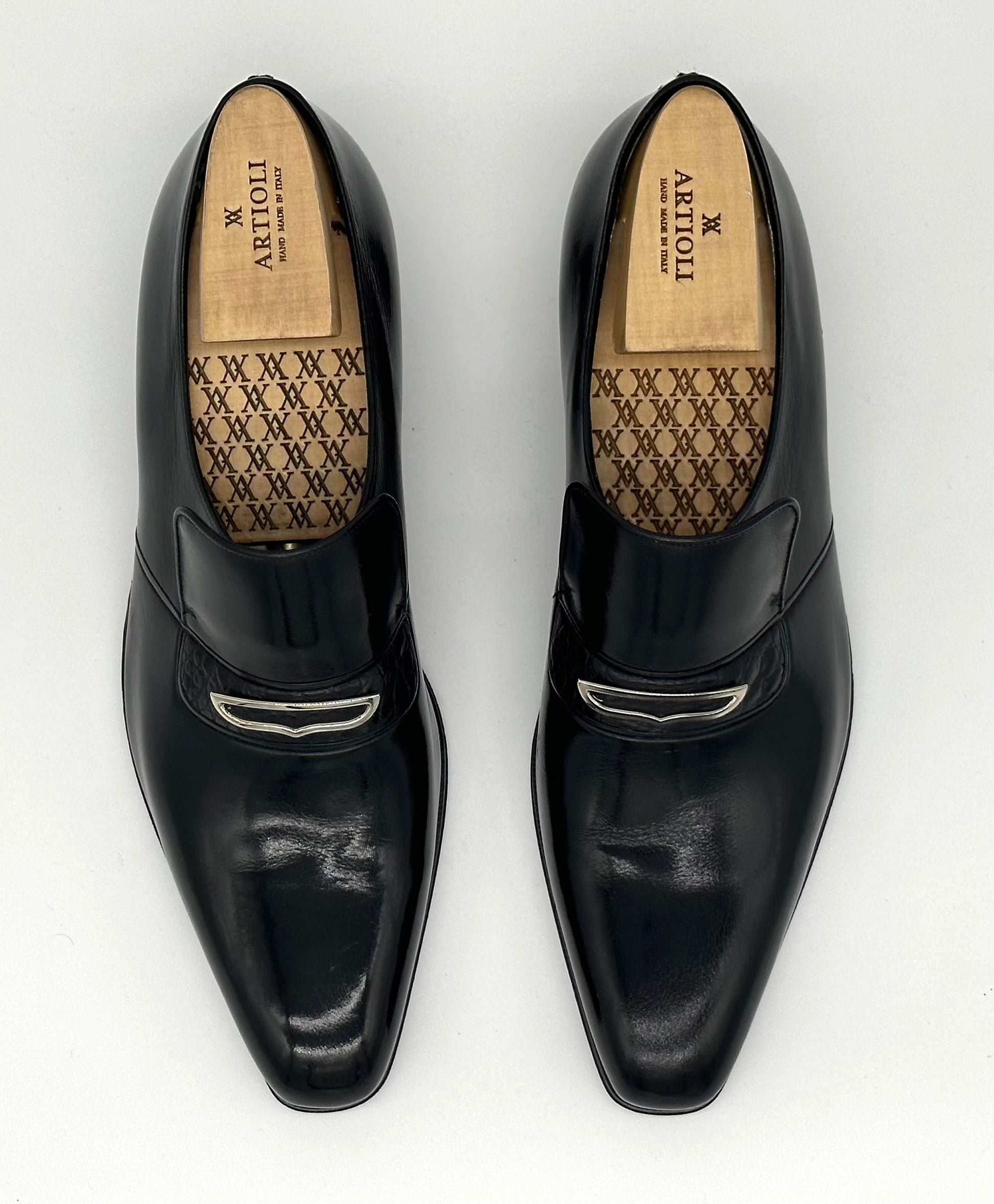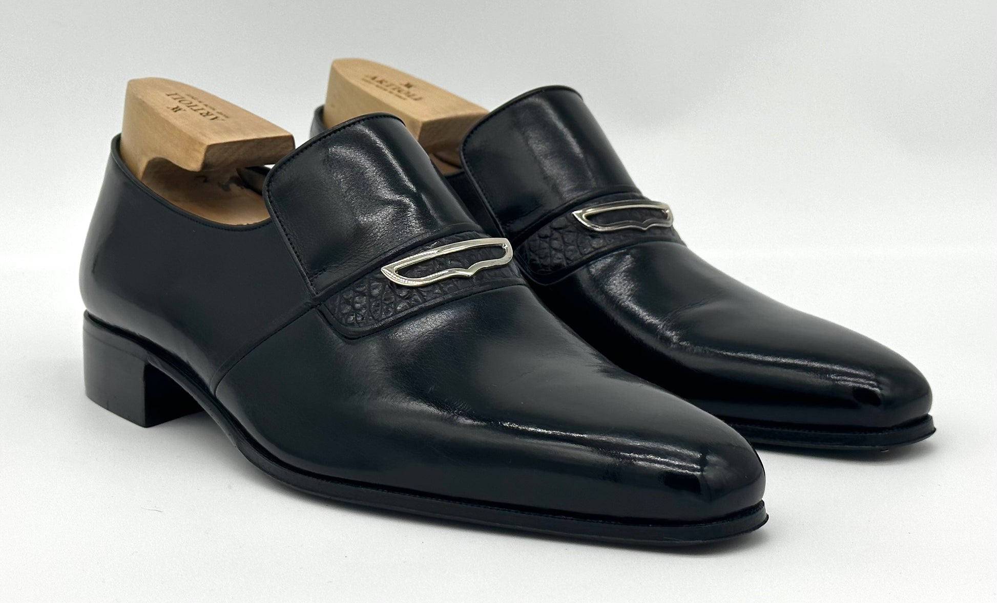 Mocassin Artioli en cuir et détail en crocodile noir.