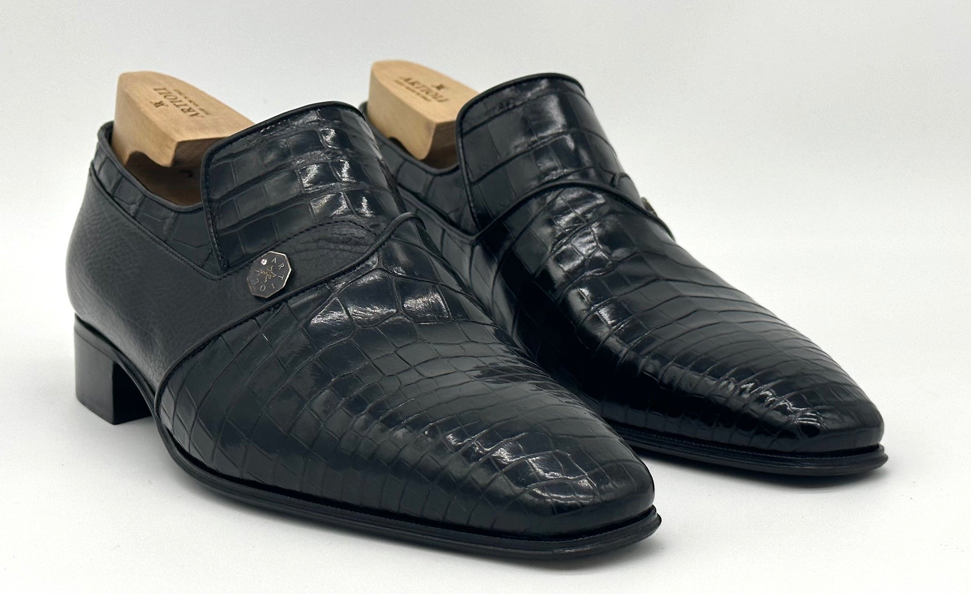 Mocassin Artioli en cuir et détail en crocodile noir.