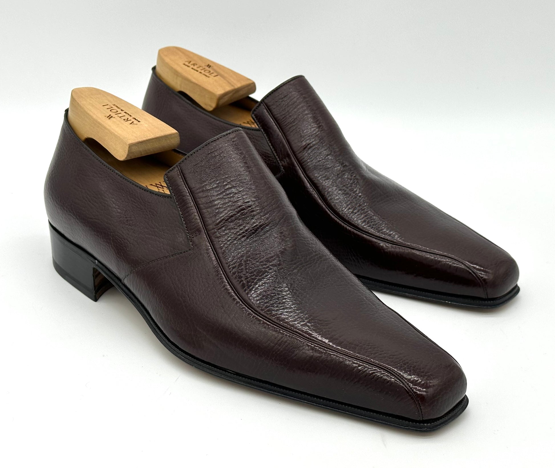 Mocassin Artioli en veau grainé marron.