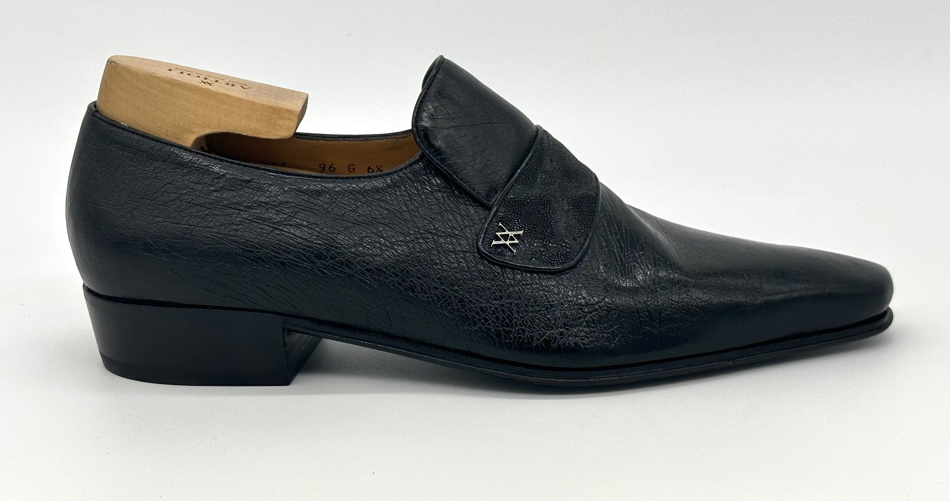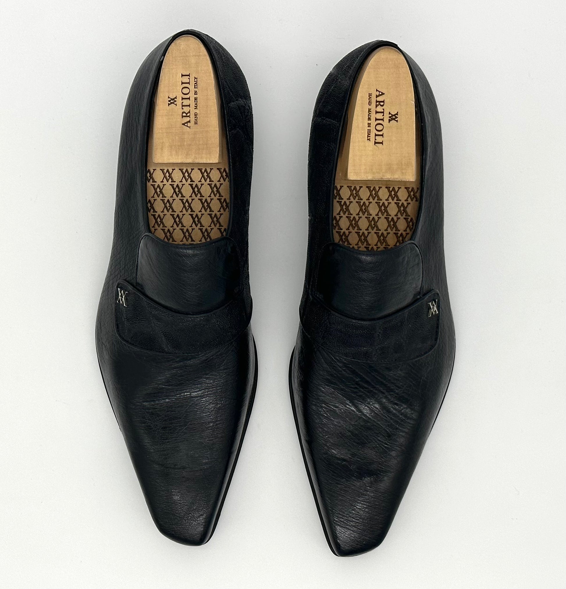 Mocassin Artioli en peau d’éléphant et Galuchats sur la bande avec semelle italienne de 2,6 cm.