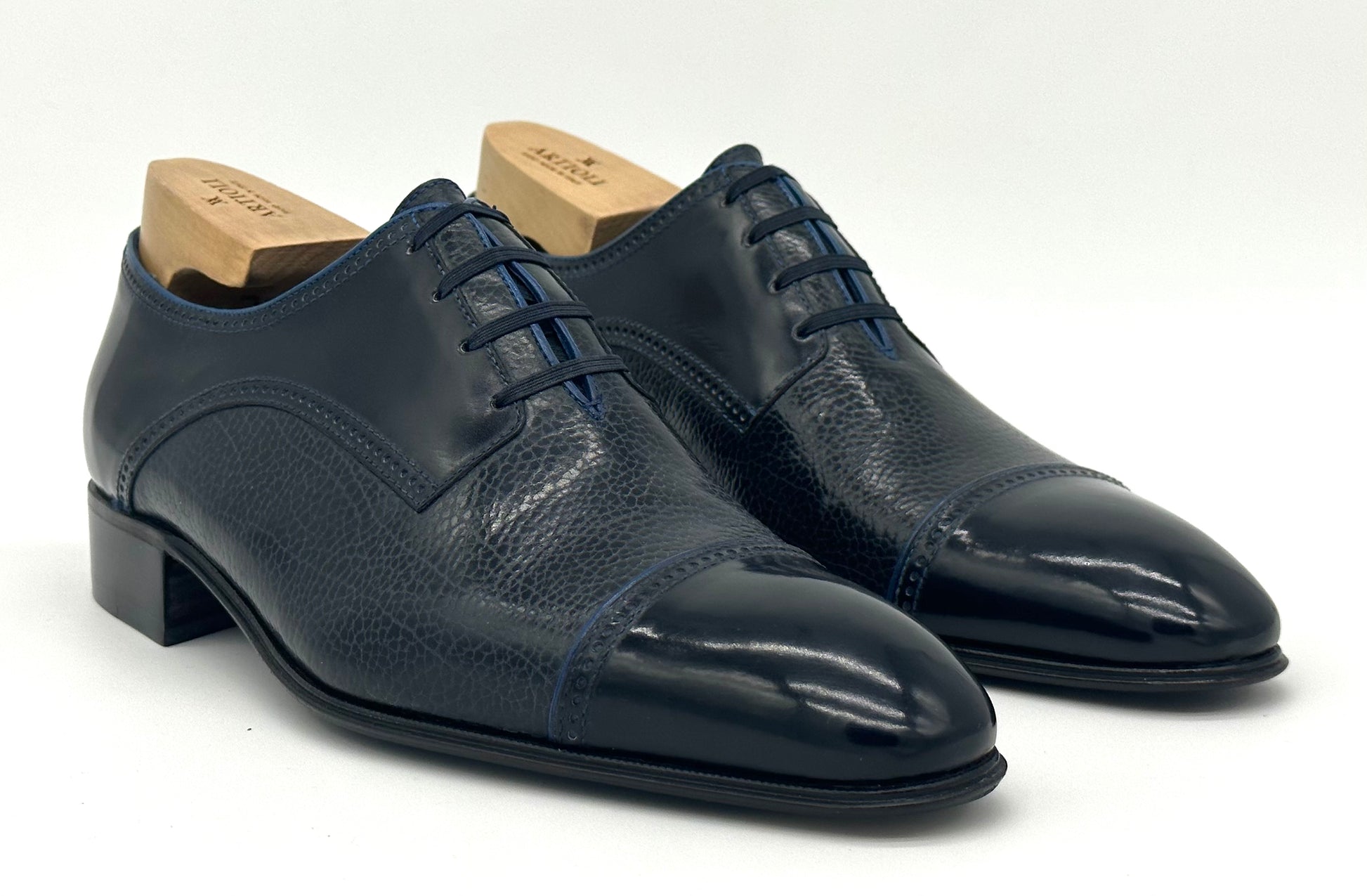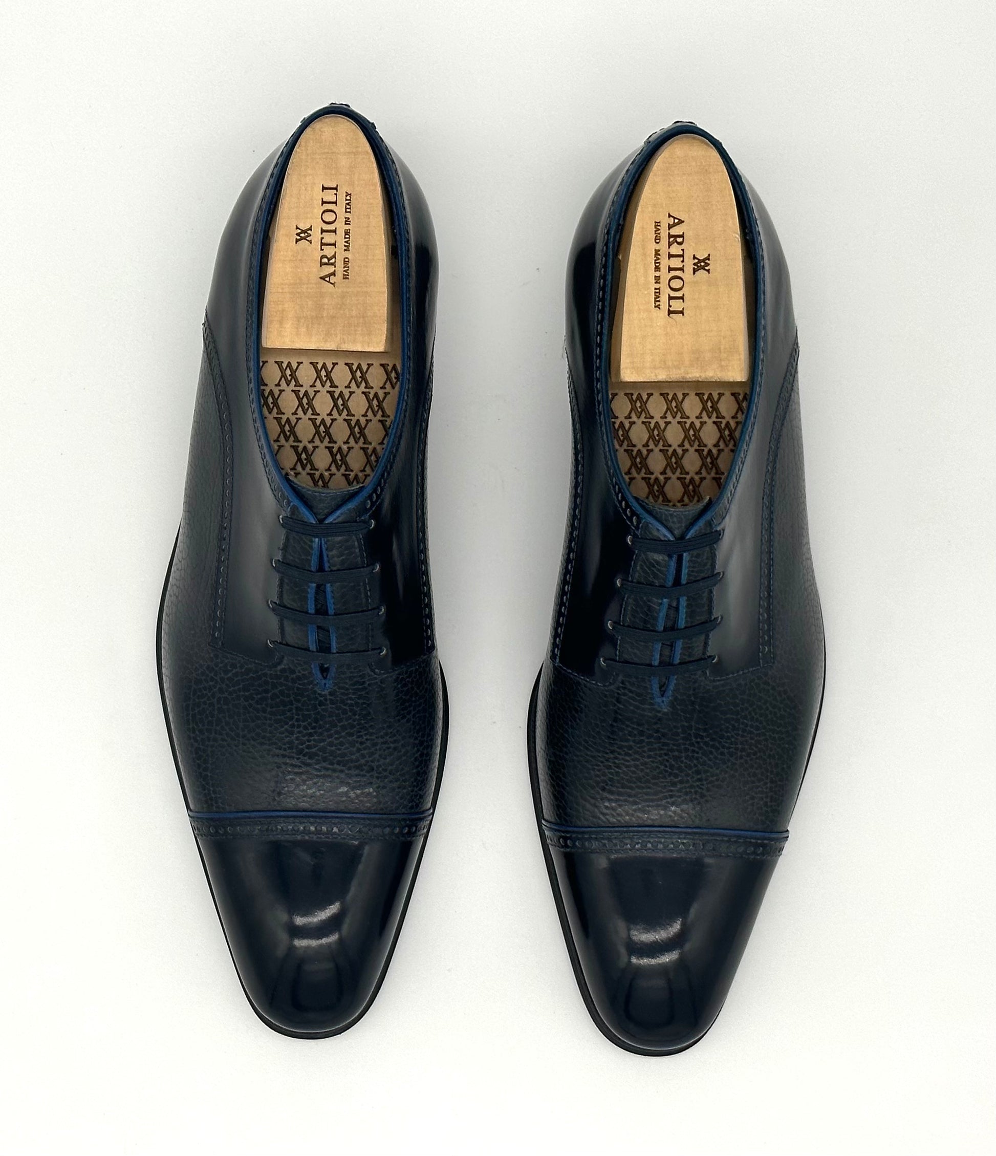 Richelieu Artioli en veau grainé bleu marine avec semelle gomme.