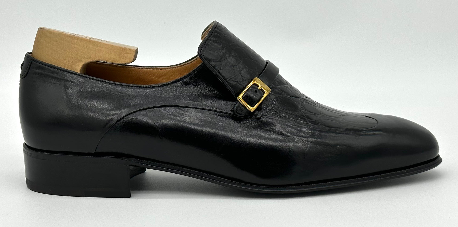 Soulier à boucle Artioli en cuir et crocodile noir.
